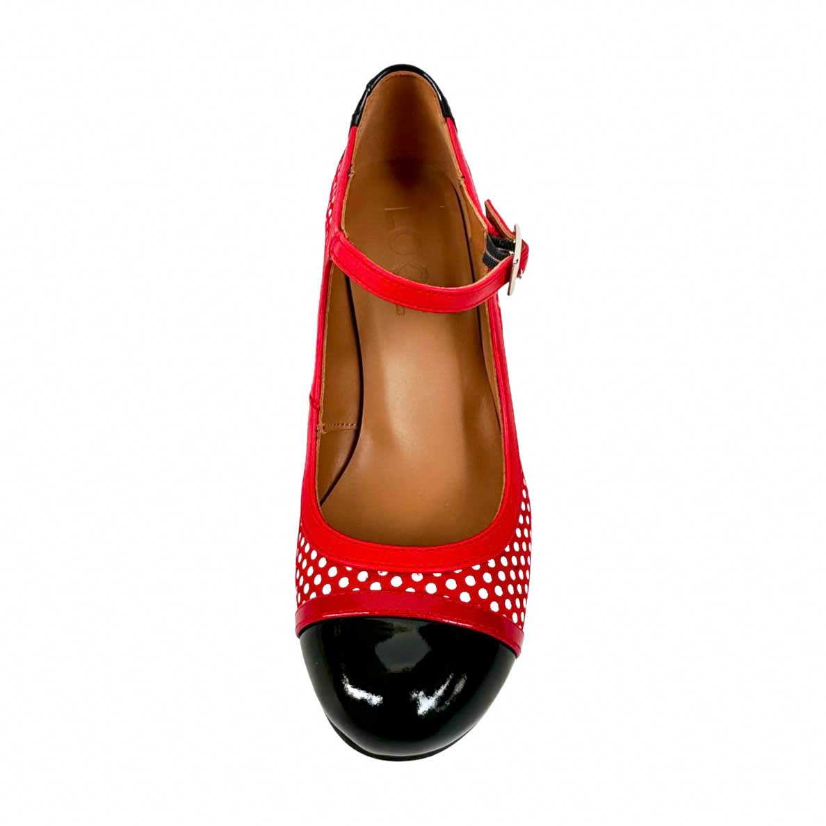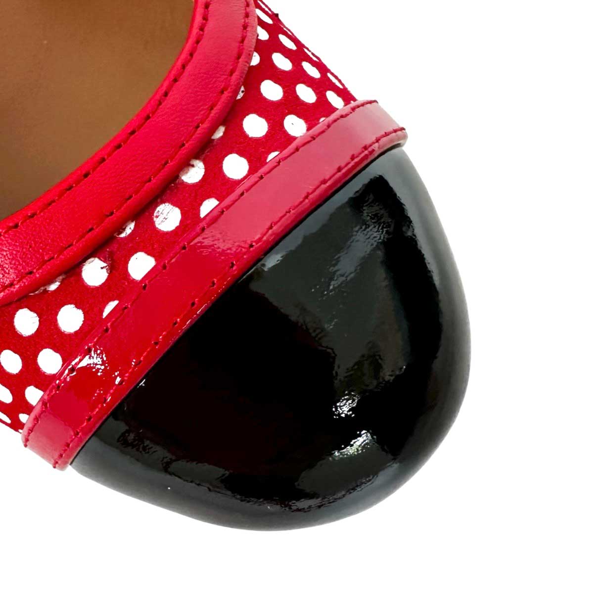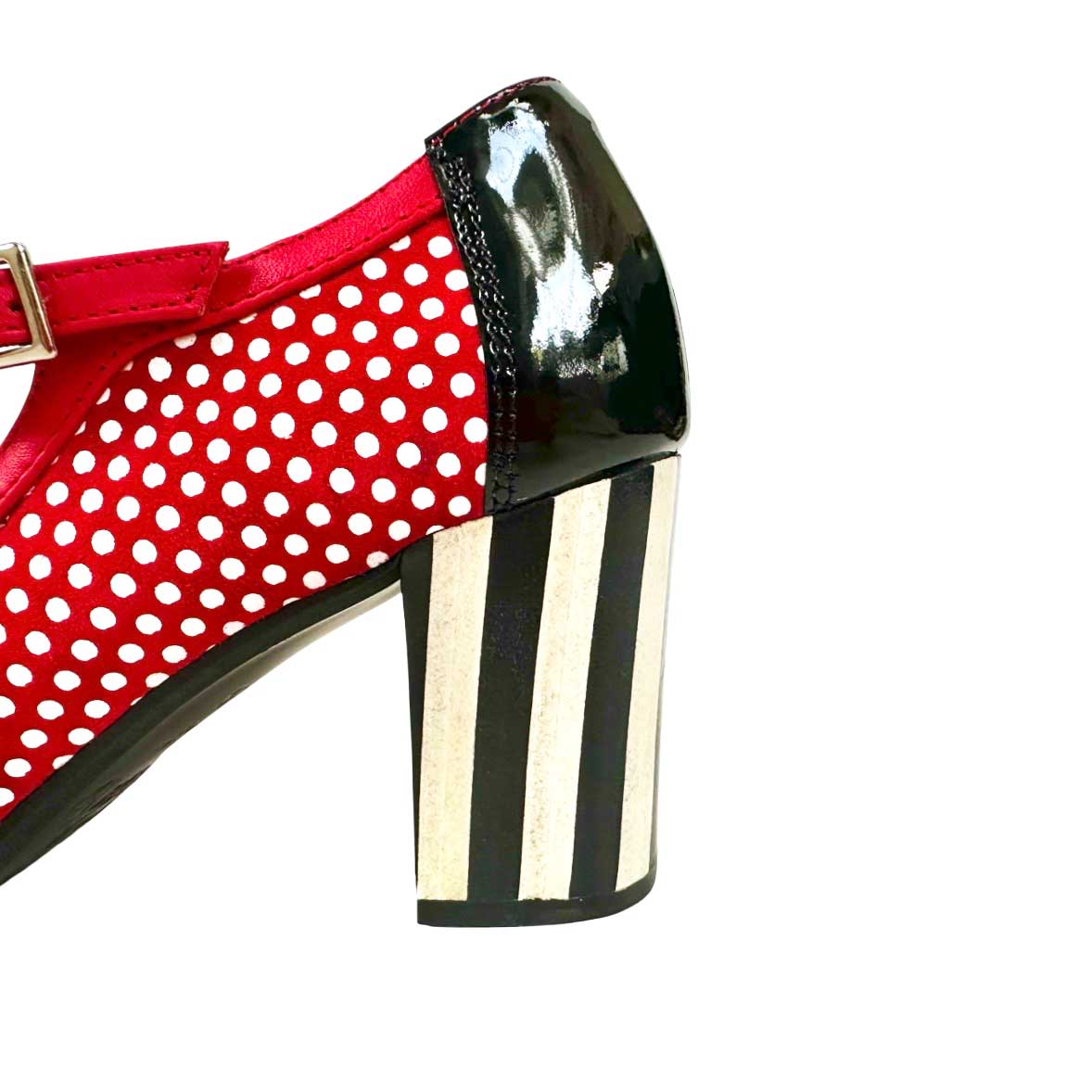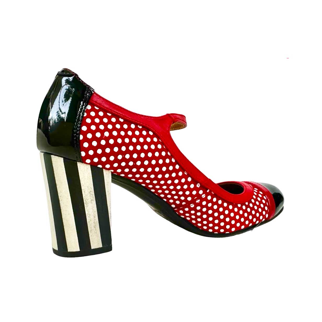 Un zapato de PIEL HECHO EN ESPAÑA que se adaptará perfectamente a tu pie por su horma y que te resultará cómodo por su plantilla de gel y su tacón ancho. Zapato en rojo y lunares en blanco con punta y talón en charol negro. Espectacular tacón forrado en piel con diseño a rayas anchas verticales blancas y negras que dan aún más personalidad al zapato. Un par de zapatos rompedor con los que no pararás de deslumbrar por su carácter y personalidad.